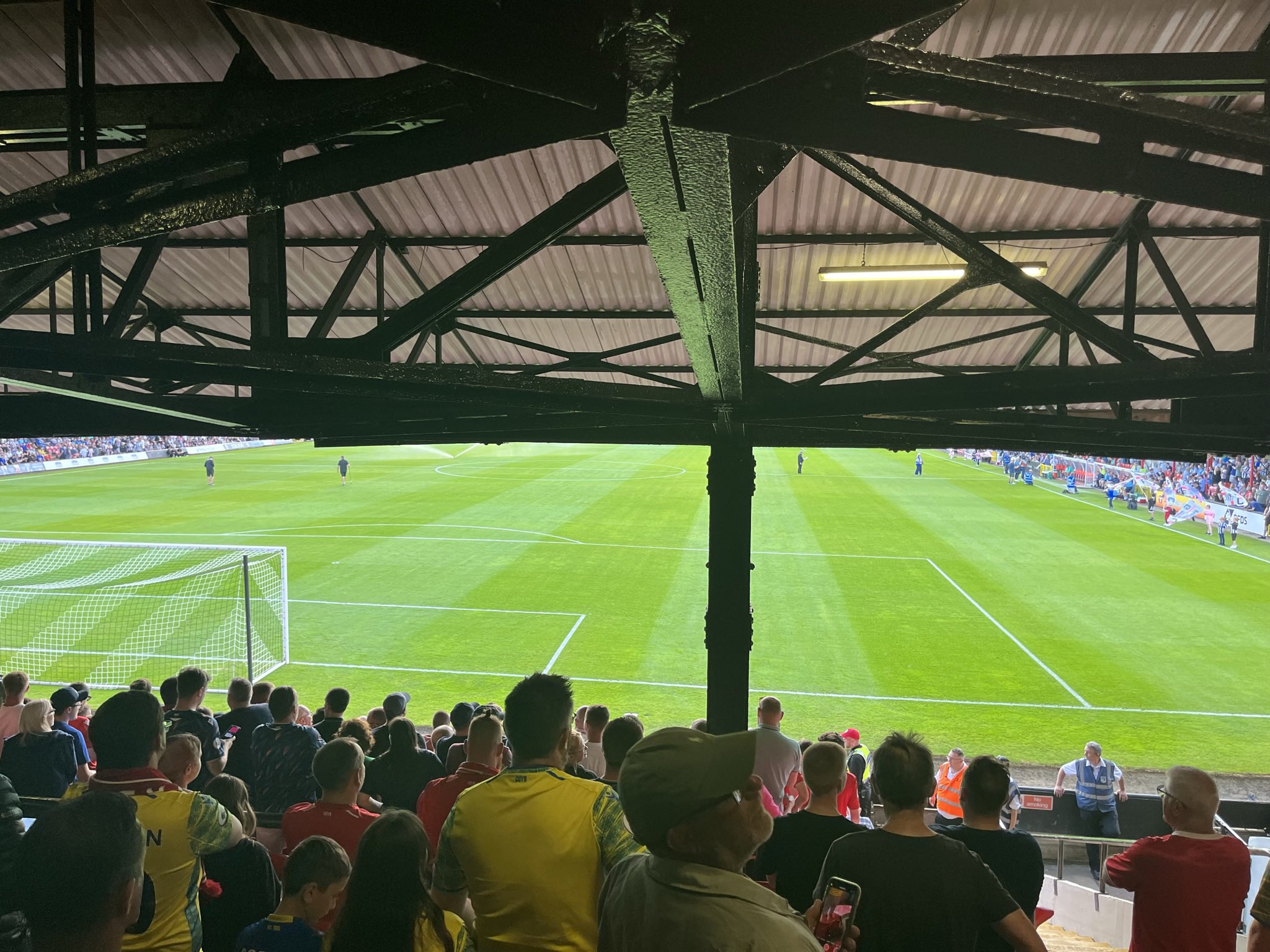 Billedet illustrerer, hvordan mange fans i engelske stadioner stadig bliver snydt for god udsigt. Selvom begge mål ses, er store dele af banen oftest blokeret – og man må strække sig efter at se afgørende øjeblikke rundt om søjlerne.