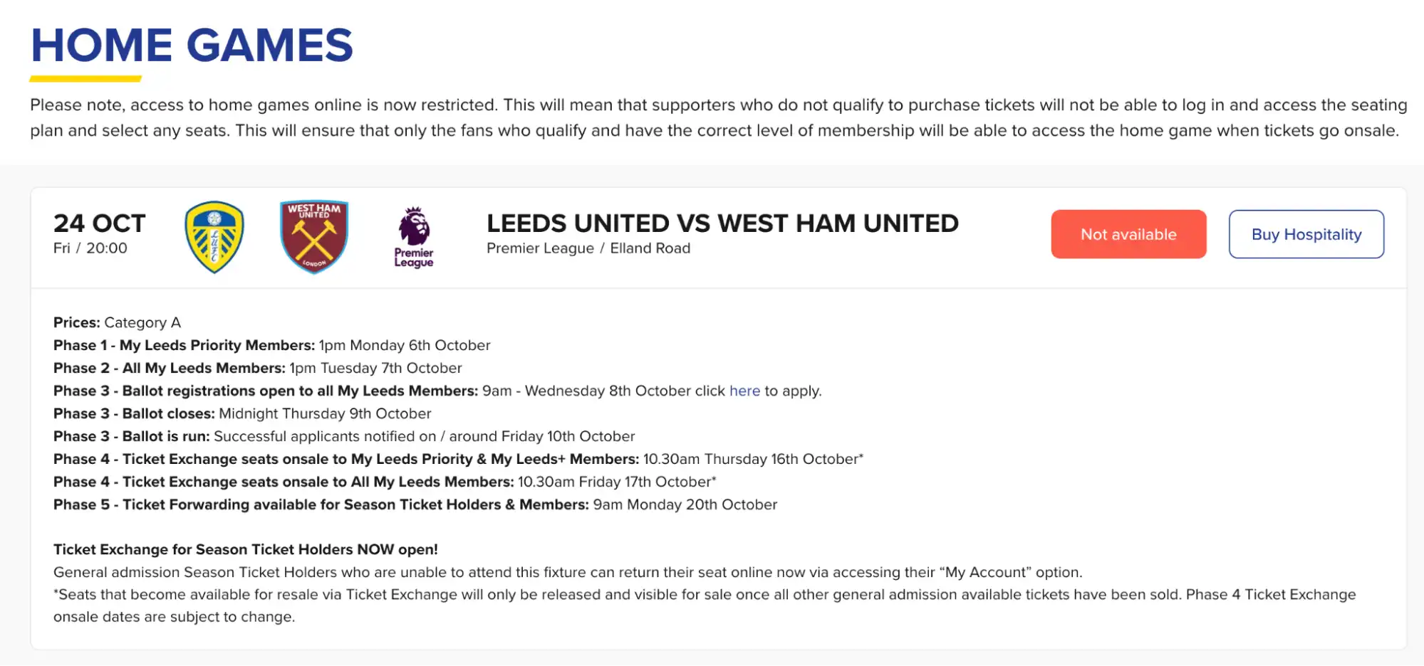 | 4A | Torsdag 10:30 (uken etter) | Priority & My Leeds+ | Ticket Exchange åpnes for prioritet. |