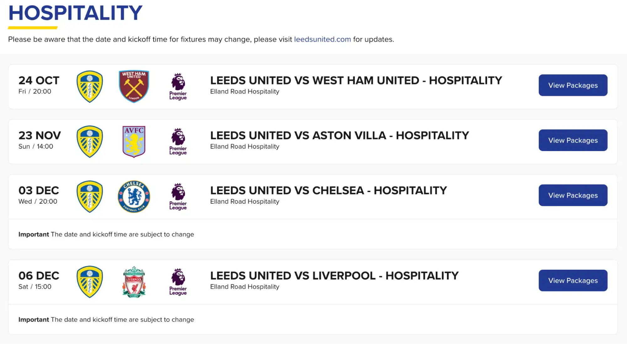 Selges via klubbens autoriserte partnere, perfekt for utenlandske fans som vil ha en garantert, problemfri Leeds-opplevelse. Lounge, mat og/eller drikke + ofte kampblad inkludert. Ofte også mulighet for transport/stadium tour.