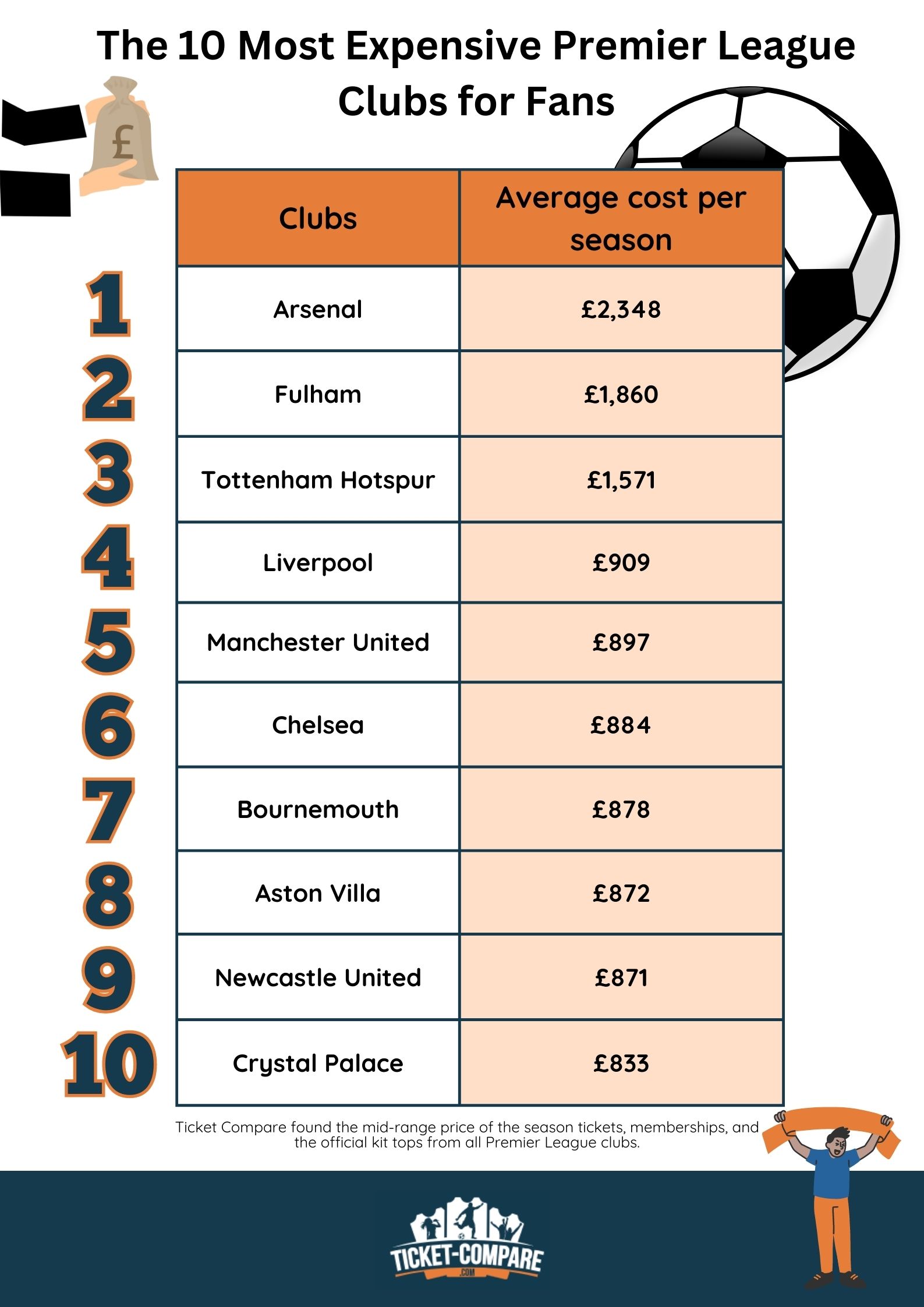 Arsenal får førstepladsen, selvom de blev nummer to sportsligt: Her skal fans nemlig betale allermest – samlet $37, heraf medlemskab på $1,130. En officiel Arsenal-trøje koster $131, og sæsonkortet (mid-range) koster $25 – næsthøjest i ligaen – efter en prisstigning på op til 6%.