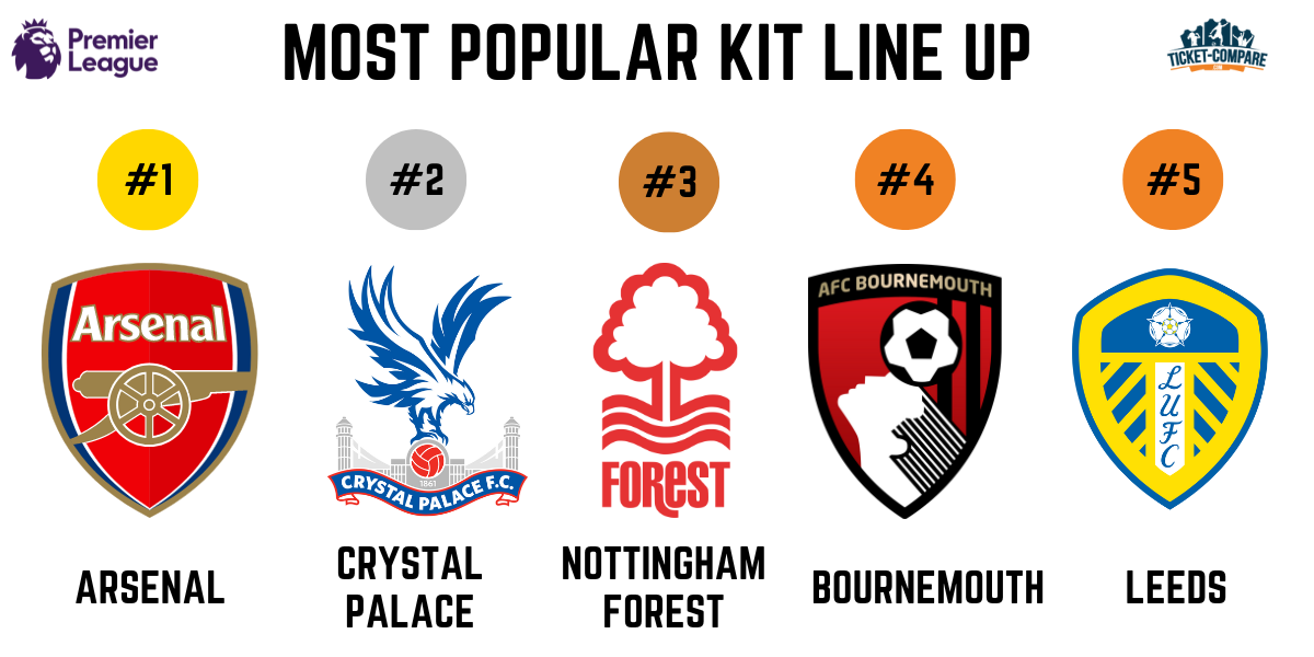 Arsenal billetter får to plasser på topp 5-listen med sin bortedrakt (4,4/5) og hjemmedrakt (4,1/5). Nykomlingen Nottingham Forest kommer på andreplass med sin tredjedrakt (4,2/5). Crystal Palace tredjedrakt tar tredjeplass (4,2/5), som er den andre Macron-drakten i denne rekken. Adidas har tre drakter med, deriblant Manchester United sin bortedrakt (4,1/5) på femteplass.