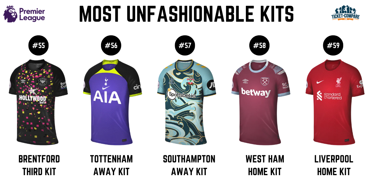 På 54. & 56. plass ser vi motsatt av enkelt – Brentford tredjedrakt var for “Jackson Pollock-aktig”, og Southampton bortedrakt ble kalt “ikke brukbar utenfor hjemmet”. Risiko kan lønne seg, men helhetsinntrykket må stemme.