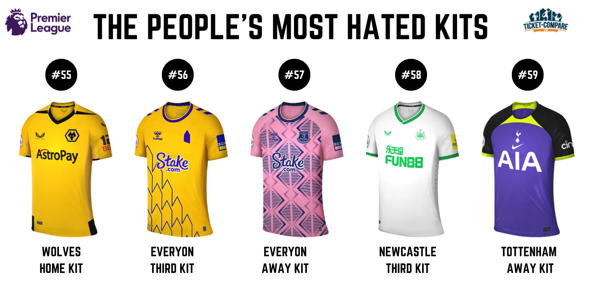Gult er ikke populært – Wolves hjemmedrakt (2,7/5) og Everton tredjedrakt (2,6/5) havner begge på bunn 5. Everton har også med bortedrakten sin (2,5/5) og er dermed eneste lag med to drakter på listen. I motsetning til Manchester Uniteds hvite bortedrakt, har Newcastles hvite tredjedrakt (2,4/5) ikke blitt like godt mottatt. Sisteplassen går til Tottenham bortedrakt (1,9/5) – årets minst likte drakt.